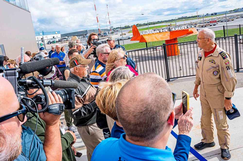 NIC ADAM / FREE PRESS Leon Evans, Chief Pilot of the Avro Lancaster, speaks to aviation aficionados and press at the Royal Aviation Museum of Western Canada on Tuesday afternoon.