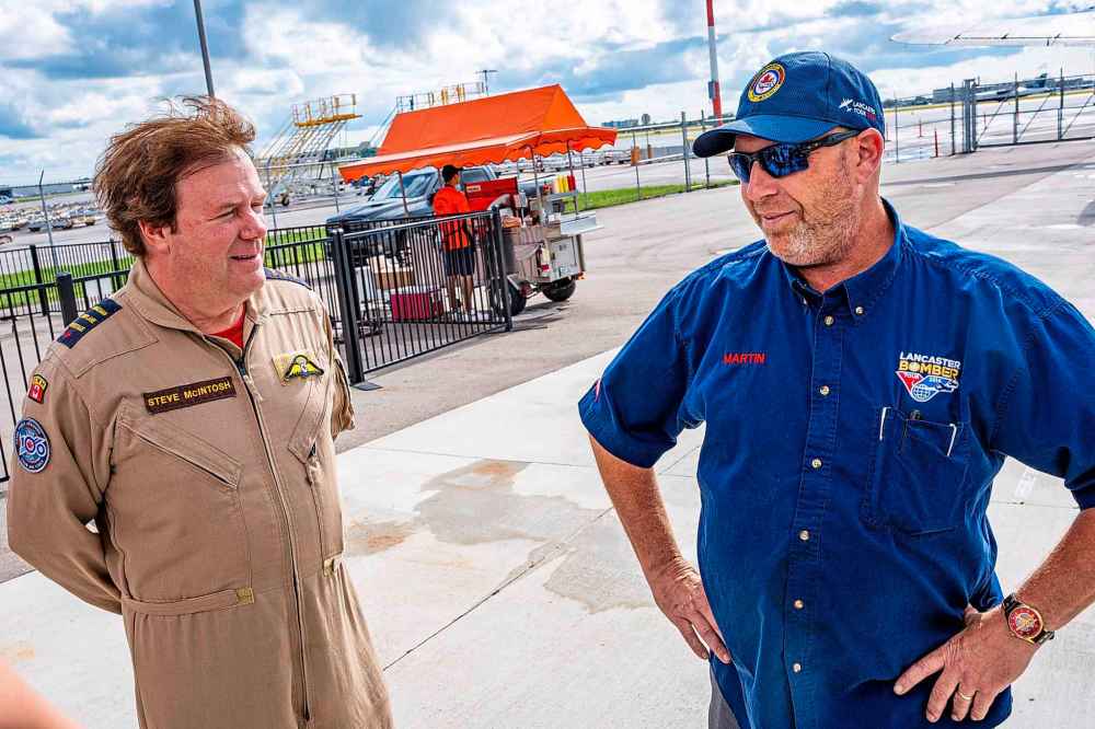 NIC ADAM / FREE PRESS Steve McIntosh (left), Pilot of the Avro Lancaster, and crew member Martin Graham at the Royal Aviation Museum of Western Canada on Tuesday afternoon.