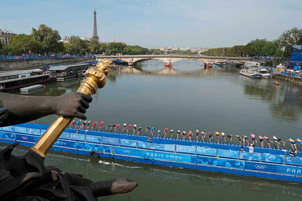 But still the Seine would prove to be a source of frustration. With the sun blazing down on the pale green water, the 55 competitors battled against the currents on the 1,500-metre swim course, which started and finished at the Pont Alexandre III bridge.