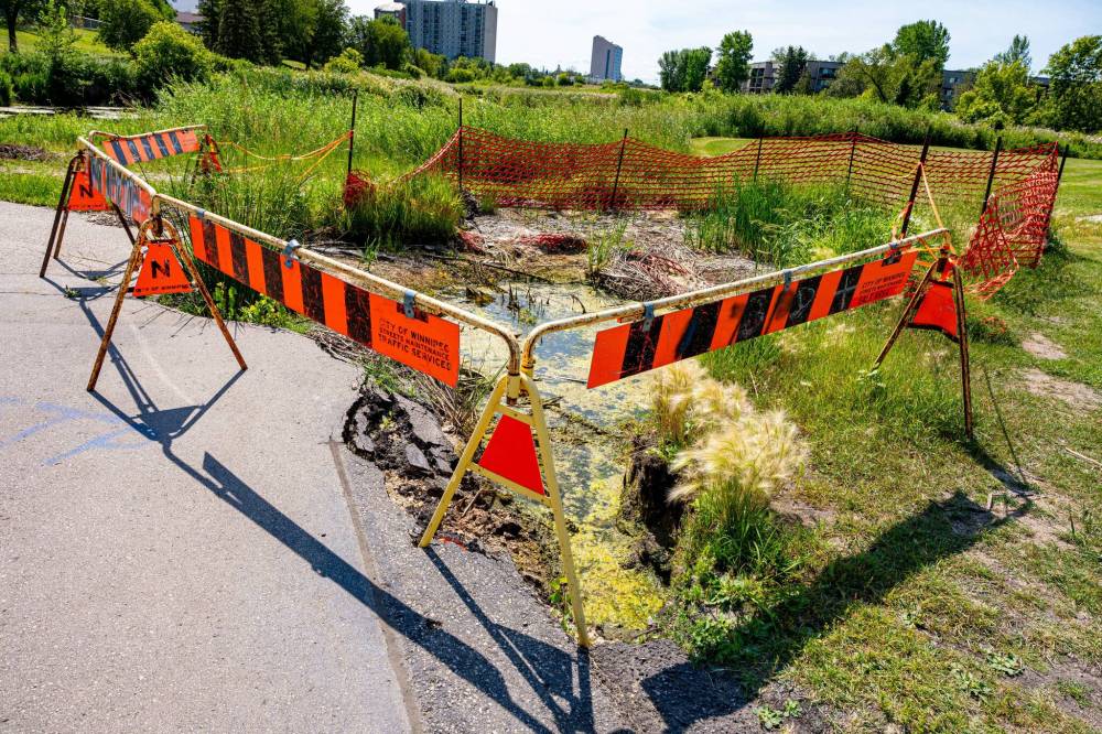 At least one barricade was spotted submerged in water, with weeds and algae in the hole on Friday. Most of the damage is located on the path that connects an Amarynth Crescent playground to the busy Sturgeon Creek active transportation route.