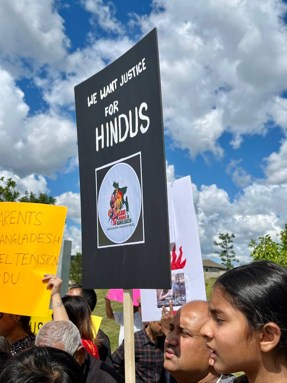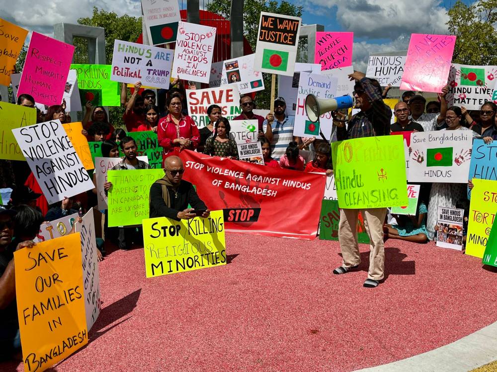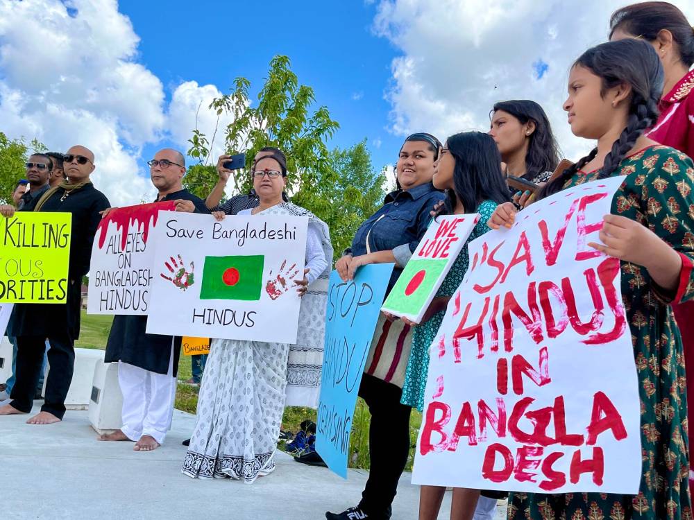 Cries in support of Bangladesh’s minority Hindu population blared across the International Mother Language Plaza in Kirkbridge Park Saturday.