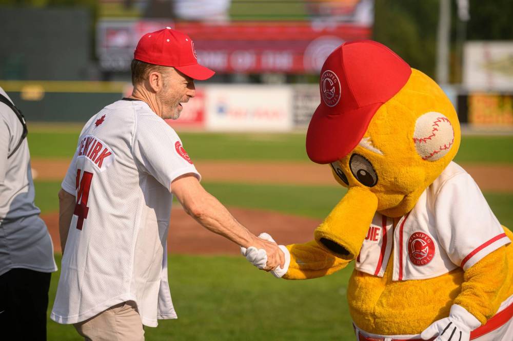 Actor Bob Odenkirk shakes hands with Goldie after throwing one of the two first pitches to kick off the game.For the first time, Goldeyes players wore special-edition dog jerseys featuring a collage of about 160 pet photos submitted by the dogs’ owners. The jerseys are set to be auctioned off at the remaining home games of the season, with the proceeds supporting the Goldeyes Field of Dreams Foundation. Proceeds from the 50-50 draw during the Aug. 17 game went to the Winnipeg Pet Rescue Shelter.