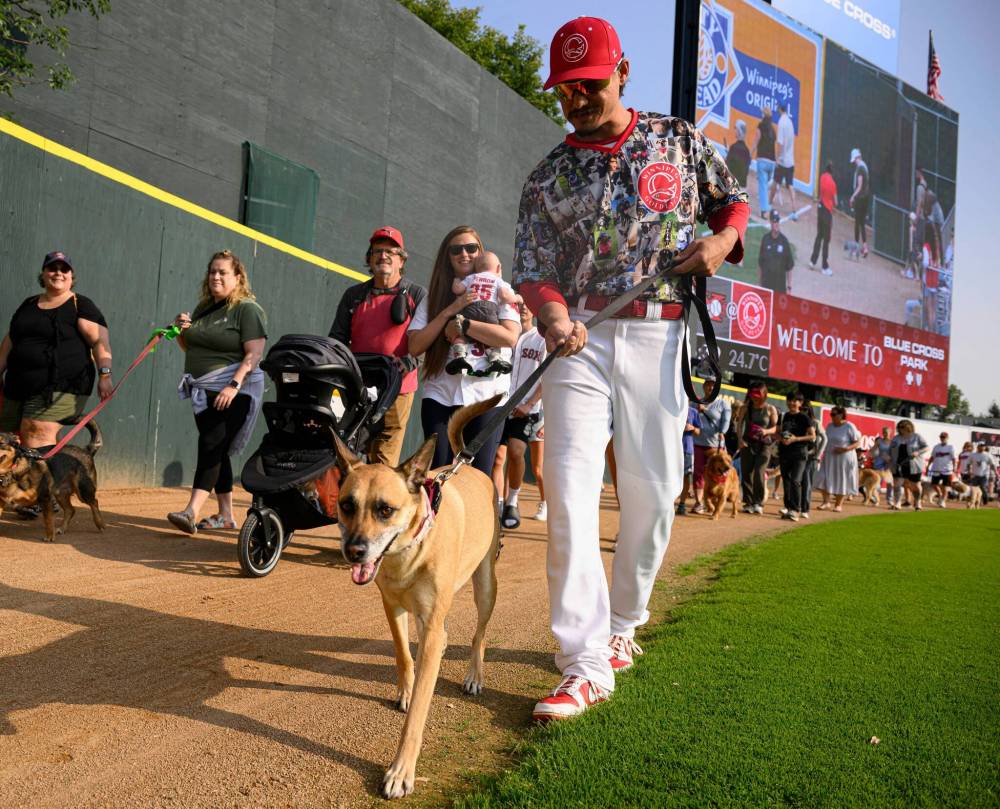 The Goldeyes' Danny Perron walks his pup Tessa around the diamond during the pup parade that preceded Saturday's game.