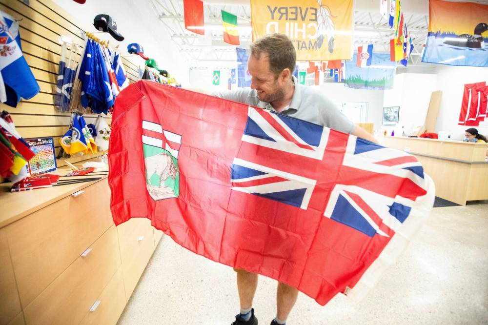 MIKAELA MACKENZIE / FREE PRESS Mathew Hobson, a sales associate at The Flag Shop on Osborne Street, displays the current Manitoba flag. According to a Probe Research poll, 49% of Manitobans would support creating a new flag for the province.
