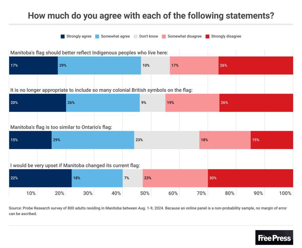 Respondents were evenly split on whether the flag should better reflect Manitoba’s Indigenous population. The response was similar to a question about whether the Union Jack and St. George’s Cross should remain.