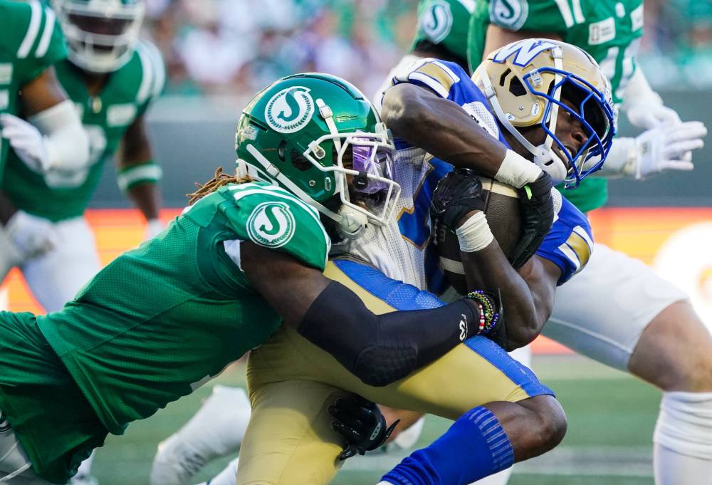 Saskatchewan Roughriders linebacker C.J. Reavis (1) tackles Winnipeg Blue Bombers receiver Lucky Whitehead (13) during the first half. (Heywood Yu / The Canadian Press)