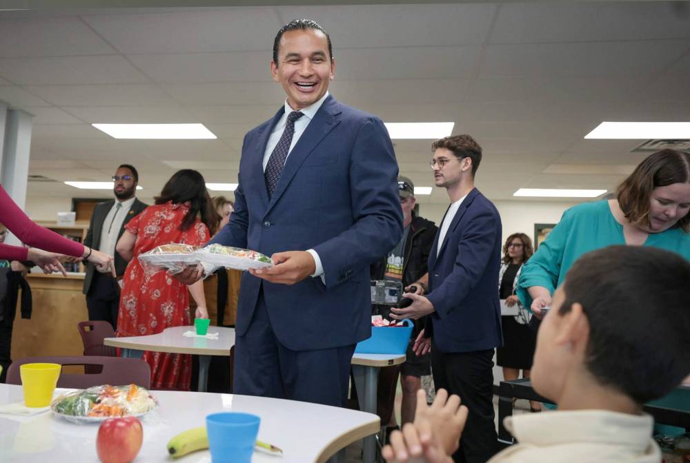 Premier Wab Kinew and Education Minister Nello Altomare shared lunch with elementary students at Donwood School on Thursday to celebrate the launch of the NDP government’s “universally accessible” nutrition program.