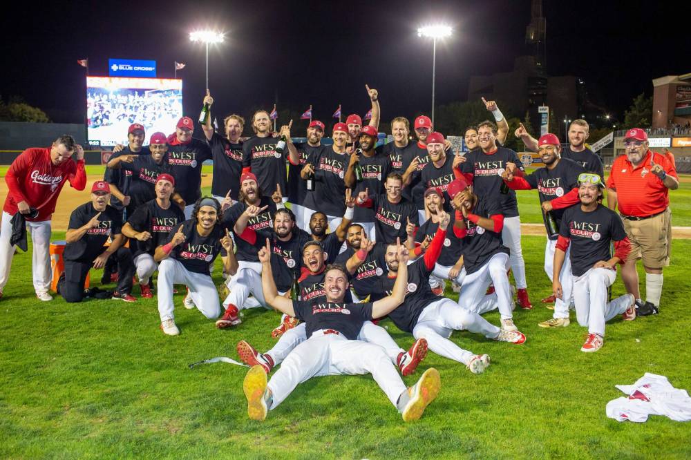 The Winnipeg Goldeyes celebrate with a team photo after defeating the Fargo-Moorhead RedHawks 3-1 to clinch the American Association West Division Final at Blue Cross Park, Thursday.