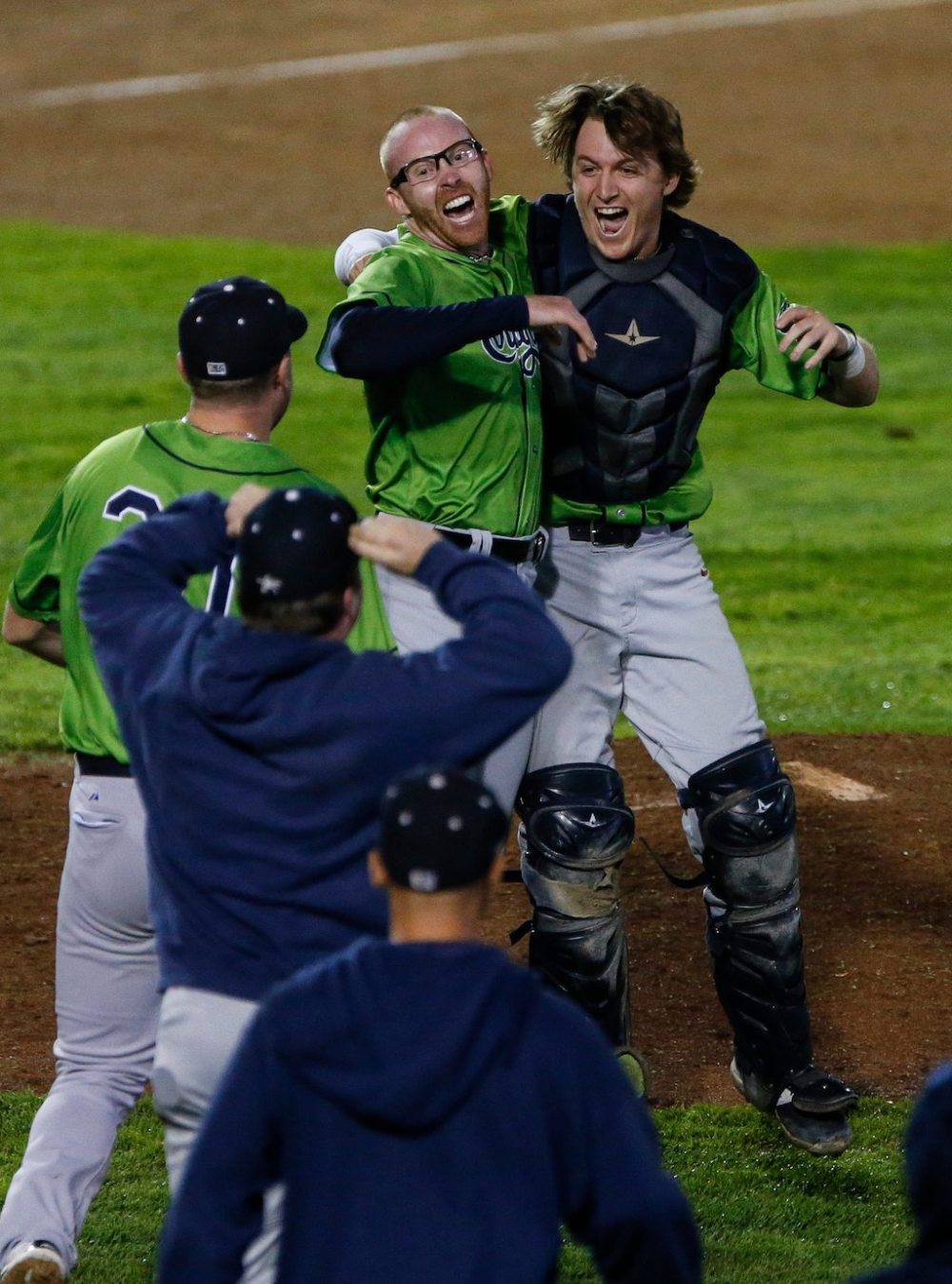 The Cougars’ Tyler Beardsley (left) and Simon Reid celebrate winning the American Association Championship in Winnipeg Tuesday.