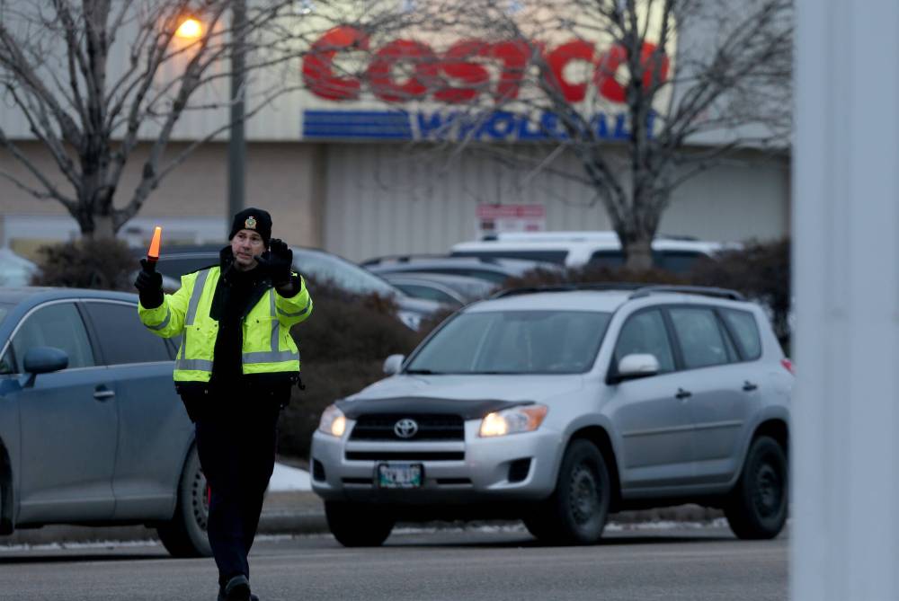 Members of the Winnipeg Police Service direct traffic in front of the St. James’s Costco store. After the acting chief of police recently said the city needs to hire 78 more officers to respond to increasing calls for service — some city officials are questioning if the use of special off-duty officers is appropriate.