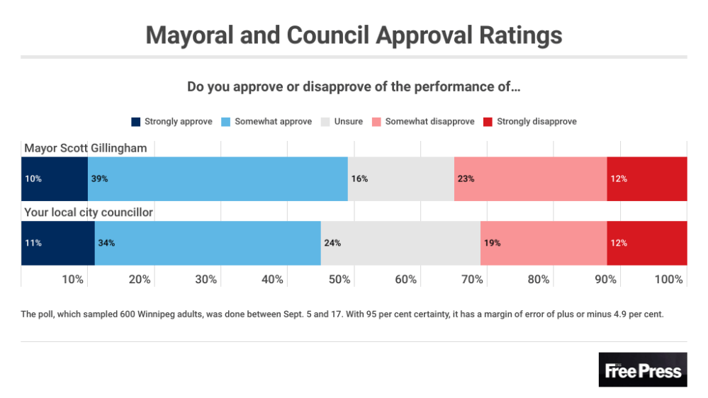 The poll also found Gillingham, who will celebrate his second anniversary as mayor on Oct. 26, has the approval of 49 per cent of Winnipeggers while city councillors have the support of 45 per cent of citizens.