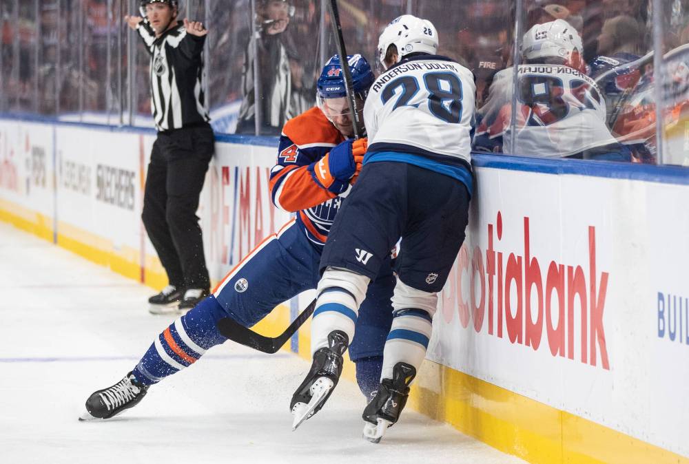 Winnipeg’s Jaret Anderson-Dolan is checked by Edmonton’s Joshua Brown.