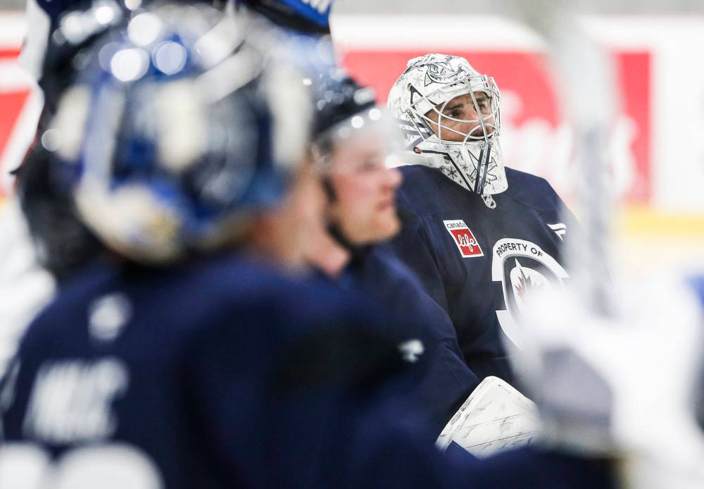 Winnipeg Jets goaltender Connor Hellebuyck listens to a coach during NHL training camp practice in Winnipeg, Friday.