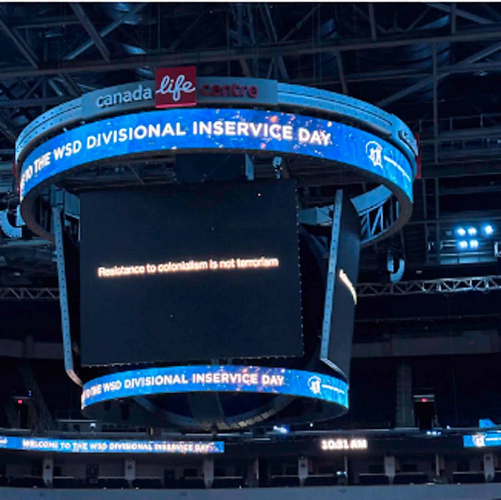 During an in-service day for Winnipeg School Division employees at the Canada Life Centre Wednesday, the statement: “Resistance to colonialism is not terrorism” was displayed on the arena’s massive four-sided video score clock.