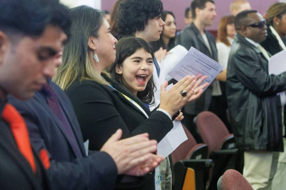 Josefa Cueto, 11, cheers after taking her oath of citizenship with the rest of her family on Thursday morning.