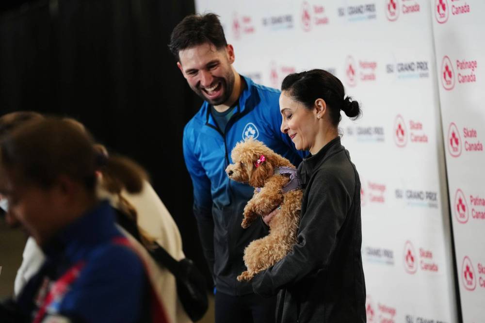 Deanna Stellato-Dudek (right) holds her dog Golden next to partner Maxime Deschamps following the pairs practice session at the Skate Canada International figure skating competition in Halifax Thursday.