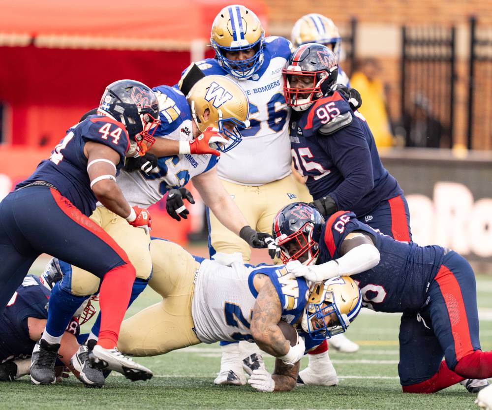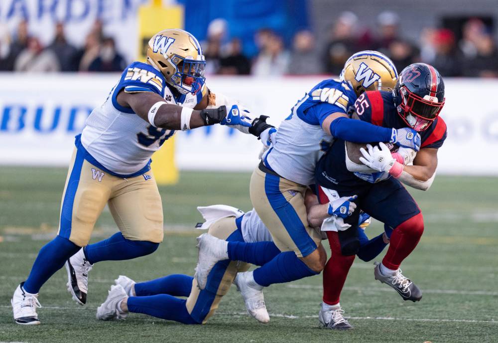 Winnipeg Blue Bombers linebacker Tony Jones (second right) tackles Montreal Alouettes running back Walter Fletcher (right) during second half CFL football action in Montreal on Saturday, Oct. 26, 2024. THE CANADIAN PRESS/Christinne Muschi