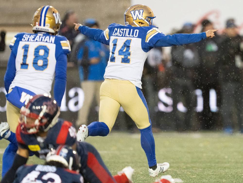 Winnipeg Blue Bombers kicker Sergio Castillo (14) celebrates his game-winning field goal over the Montreal Alouettes during second half CFL football action in Montreal on Saturday, Oct. 26, 2024. THE CANADIAN PRESS/Christinne Muschi