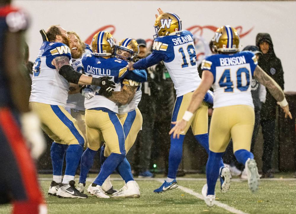 Winnipeg Blue Bombers kicker Sergio Castillo, centre facing, celebrates his game winning field goal with teammates over the Montreal Alouettes during second half CFL football action in Montreal on Saturday, Oct. 26, 2024. THE CANADIAN PRESS/Christinne Muschi