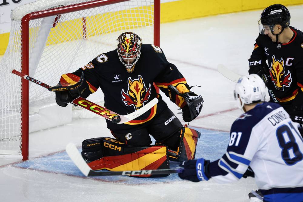 Winnipeg Jets’ Kyle Connor, bottom right, has his shot stopped by Calgary Flames goalie Dustin Wolf during second period NHL hockey action in Calgary on Saturday, Oct. 26, 2024.THE CANADIAN PRESS/Jeff McIntosh