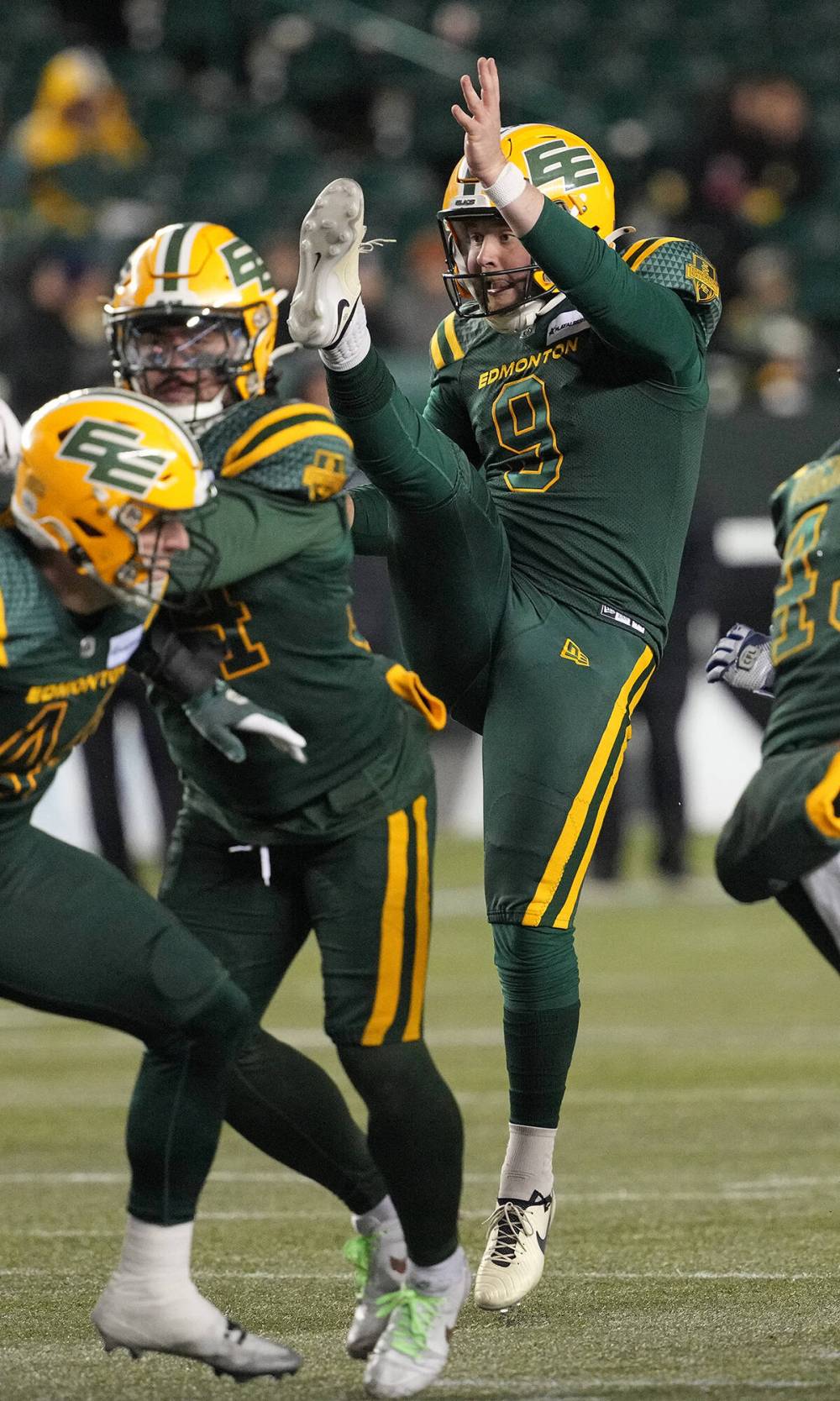 Larry Wong / THE CANADIAN PRESS Jake Julien booted a 54-yard rouge in overtime Friday to give the Edmonton Elks a one-point victory over the Toronto Argonauts.