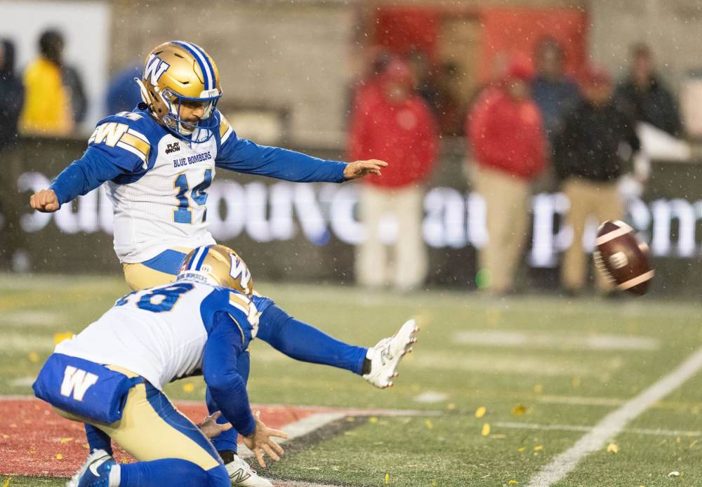 Christinne Muschi / THE CANADIAN PRESS Winnipeg Blue Bombers kicker Sergio Castillo kicks a field goal for the win over the Montreal Alouettes during the final seconds of their game in Montreal on Saturday.