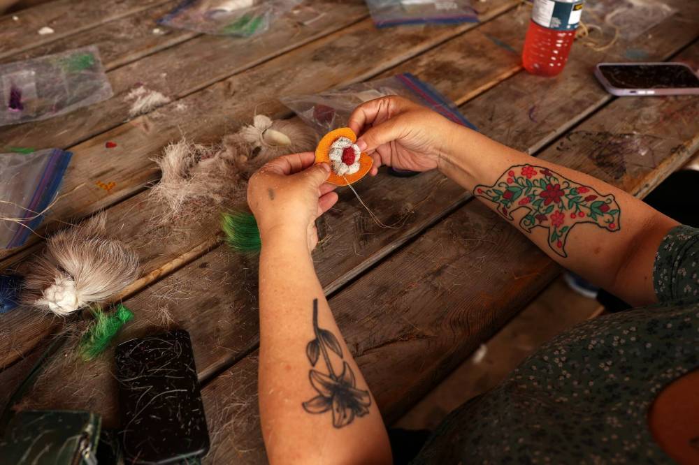 Tim Smith for The Narwhal The culture camp participants learn caribou tufting and make keychains.