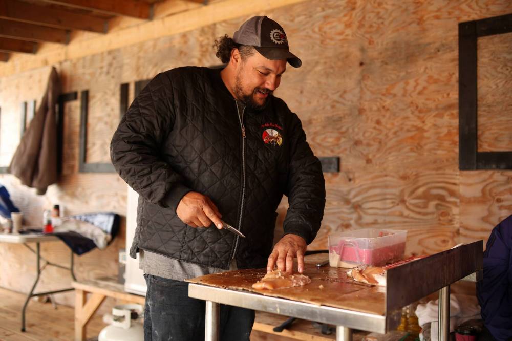 Tim Smith for The Narwhal Jimmy Lockhart cleans and fillets brook trout to pan fry for elders and other guests during the public launch of the Kitaskeenan Kaweekanawaynichikatek project.