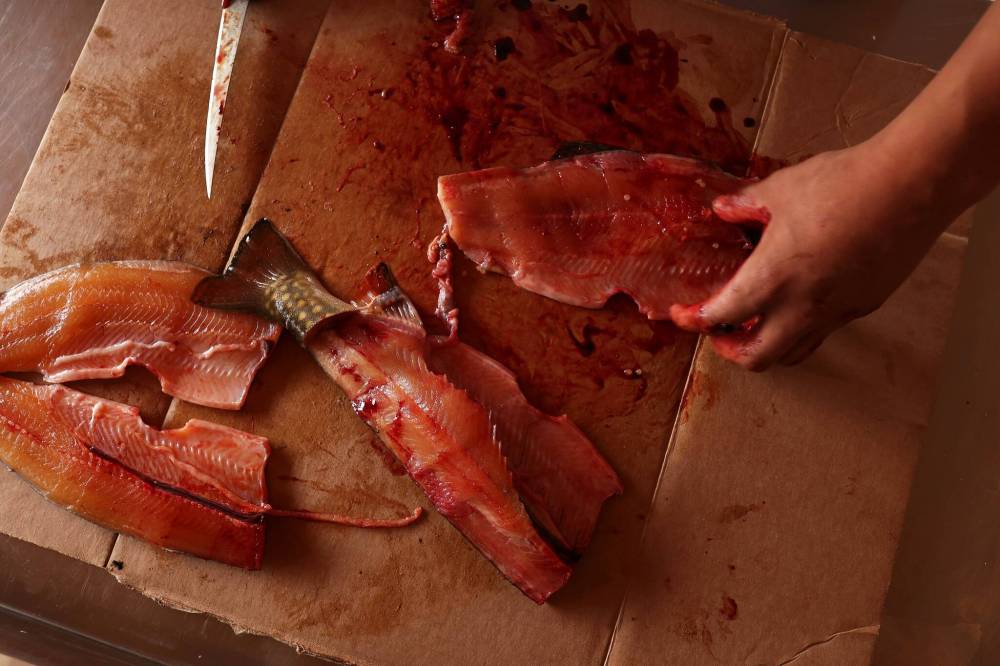 Tim Smith for The Narwhal Freshly caught brook trout are cleaned and filleted in preparation for pan-frying.