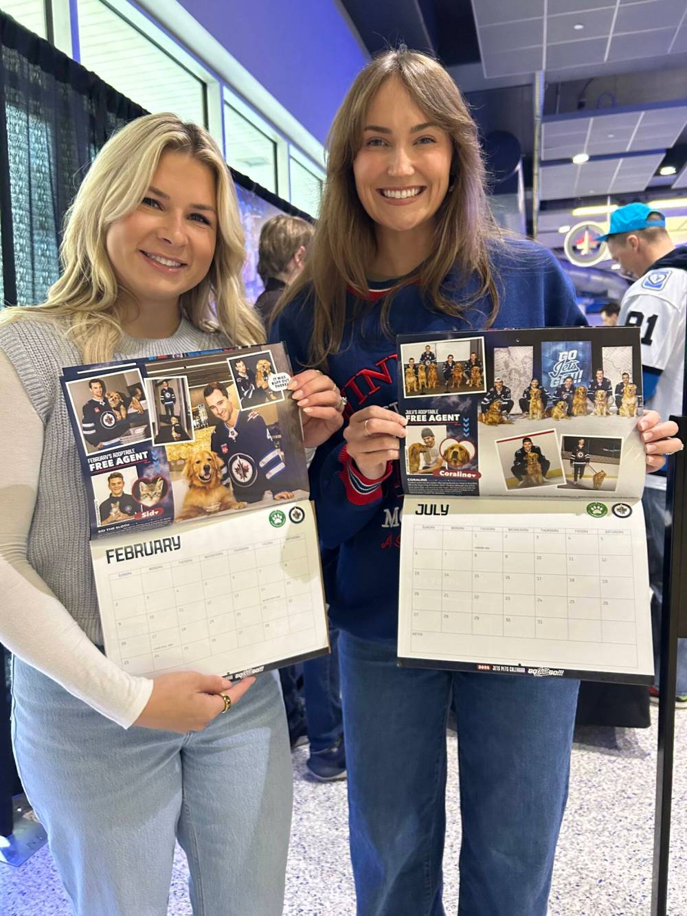 Kiera Pionk (left) with Destiny Samberg at the launch of the 2025 Jets Pets calendar at the Canada Life Centre on Nov. 9, 2024. The calendar is raising funds for Winnipeg animal rescue D’Arcy’s ARC.