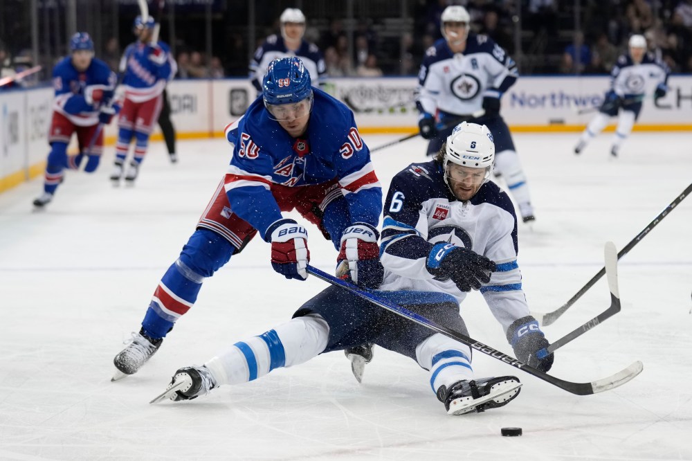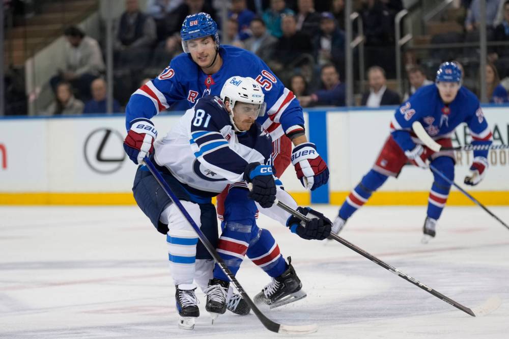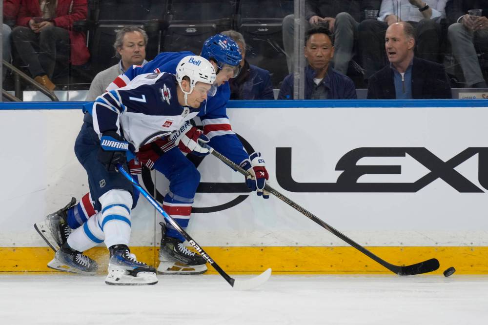 Seth Wenig / The Associated Press New York Rangers' Will Cuylle, left, and Winnipeg Jets' Colin Miller compete for the puck during the third period.