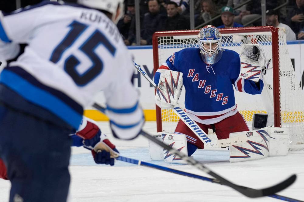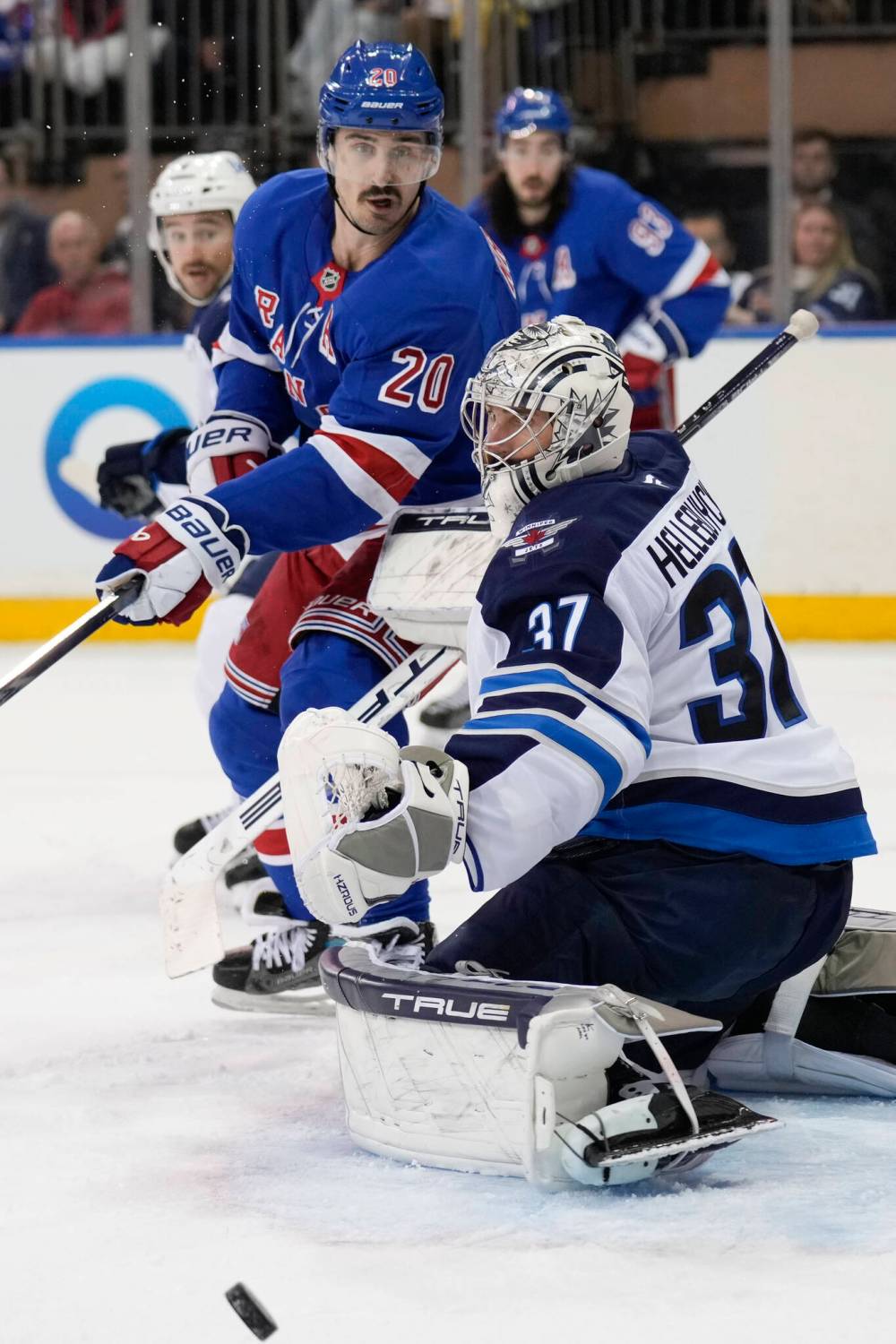 Seth Wenig / The Associated Press New York Rangers' Chris Kreider, top, and Winnipeg Jets goaltender Connor Hellebuyck watch the puck during the third period.
