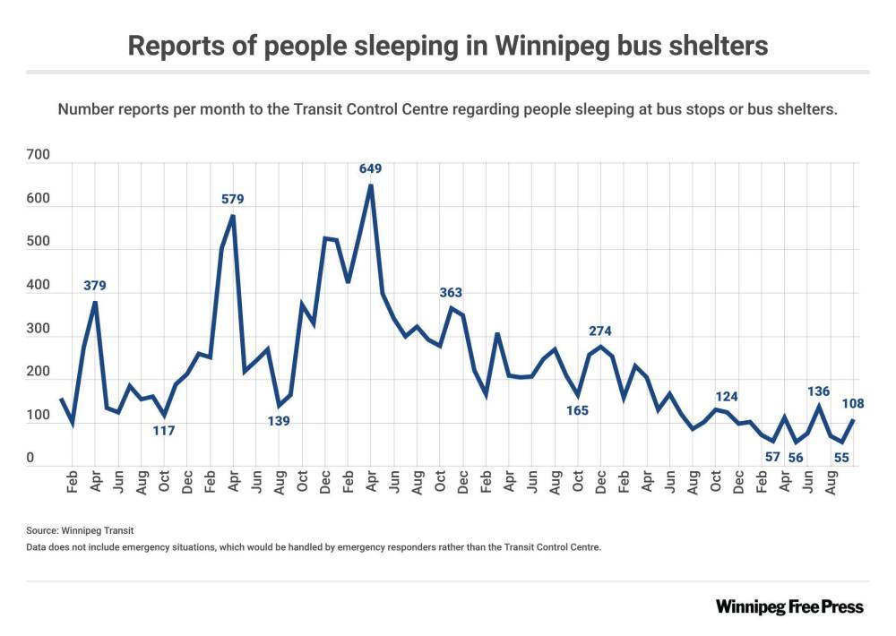 Winnipeg Transit said employees who observe someone sleeping in a shelter are expected to report the matter to the control centre. Members of the public who call 311 about an emergency involving someone sleeping in a bus shelter will be directed to call 911 and those calls may not be reported to the Transit control centre, a spokesman noted.