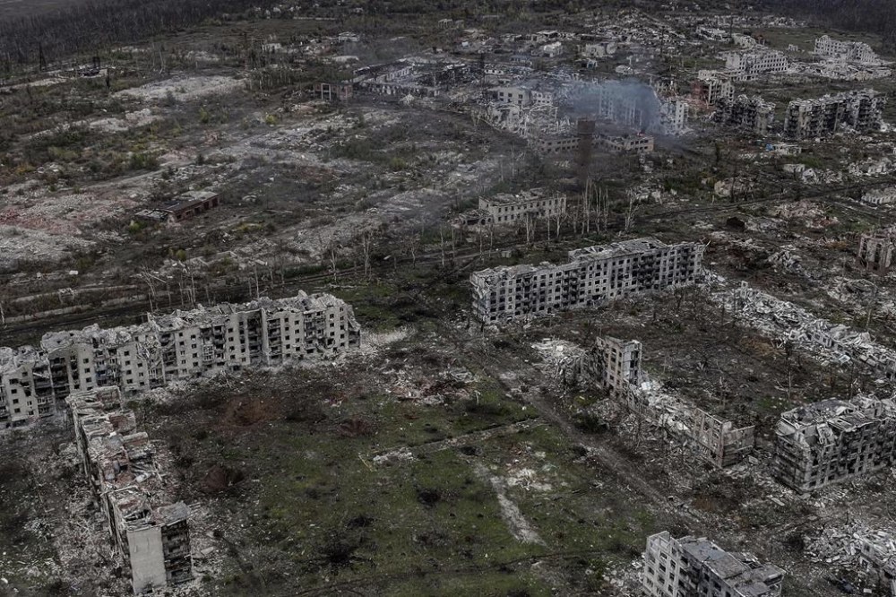 An aerial view of Chasiv Yar shows the frontline city in ruins after heavy fighting between Russian and Ukrainian forces for over a year, Donetsk Region, Ukraine, Nov. 11, 2024. (AP Photo)