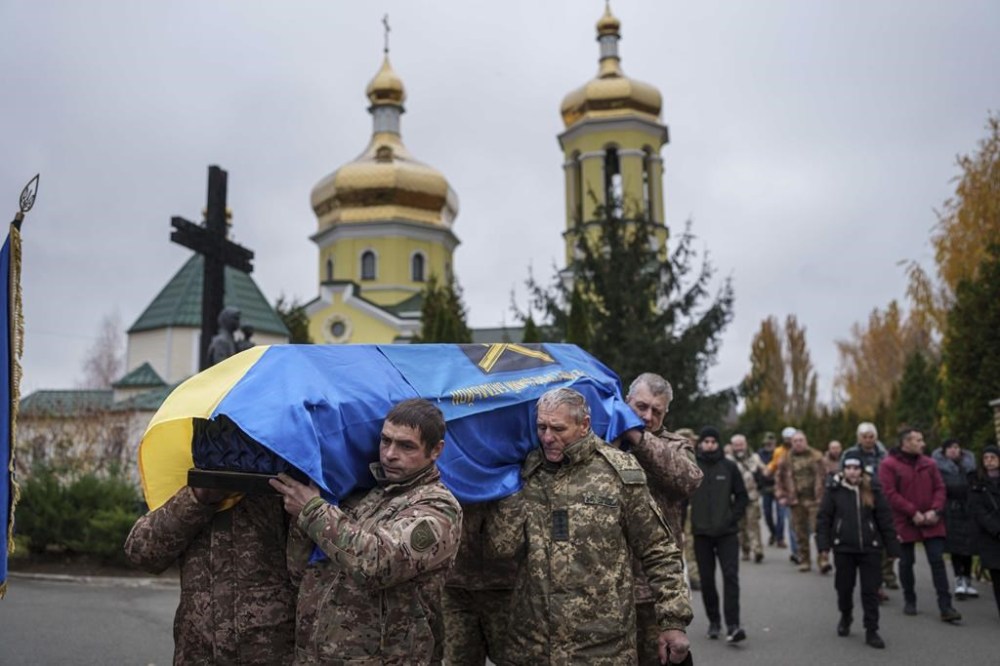 Members of the honor guard carry the coffin of Yurii Moiseev, a Ukrainian soldier of the 44th Battalion who was killed during fighting with Russian forces in Terny on Nov. 28, 2023, during the funeral ceremony in Brovary, Kyiv region, Ukraine, Nov. 11, 2024. (AP Photo/Evgeniy Maloletka)