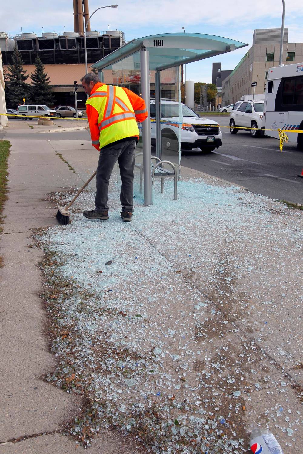 City workers clean up broken glass from a bush shelter on Maryland near Notre Dame. The city is launching a new pilot project to see if polycarbonate panels would be a viable alternative for glass in Winnipeg Transit bus shelters.