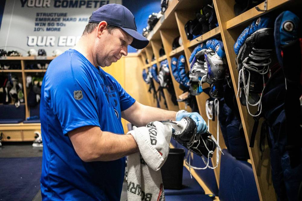 MIKAELA MACKENZIE / FREE PRESS Following six road games, the club had a brief stop at home before heading out again. Assistant equipment manager Mark Grehan dries and hangs skates in the locker room at the Canada Life Centre during the layover.