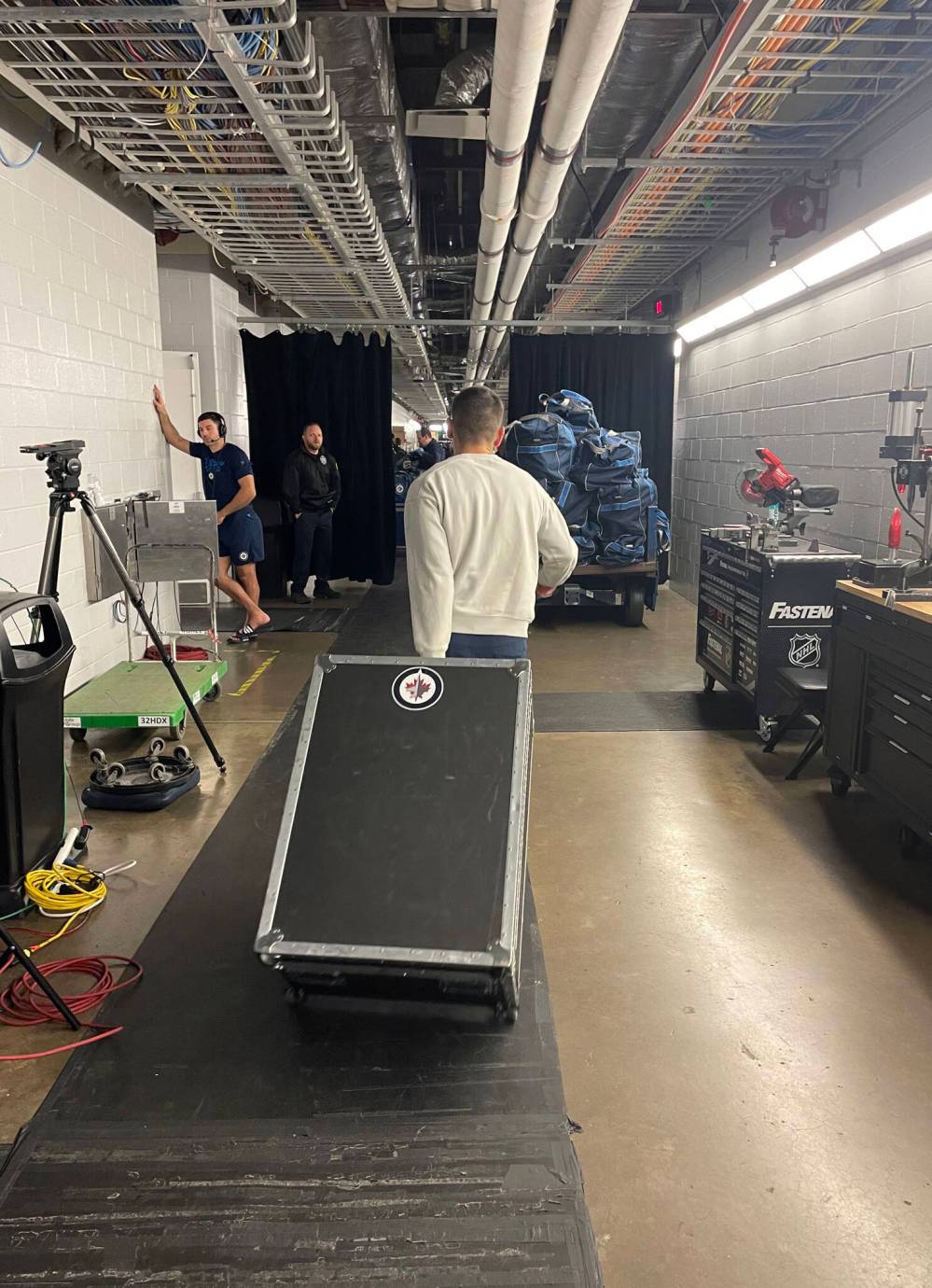 The Jets landed in Nashville around midnight, thanks partly to gaining an hour during the nearly two-hour flight as they went from the eastern time zone back to the central, and then McMaster’s crew was off to Bridgestone Arena into the wee hours to get things set up once again for Saturday’s game against the Predators.