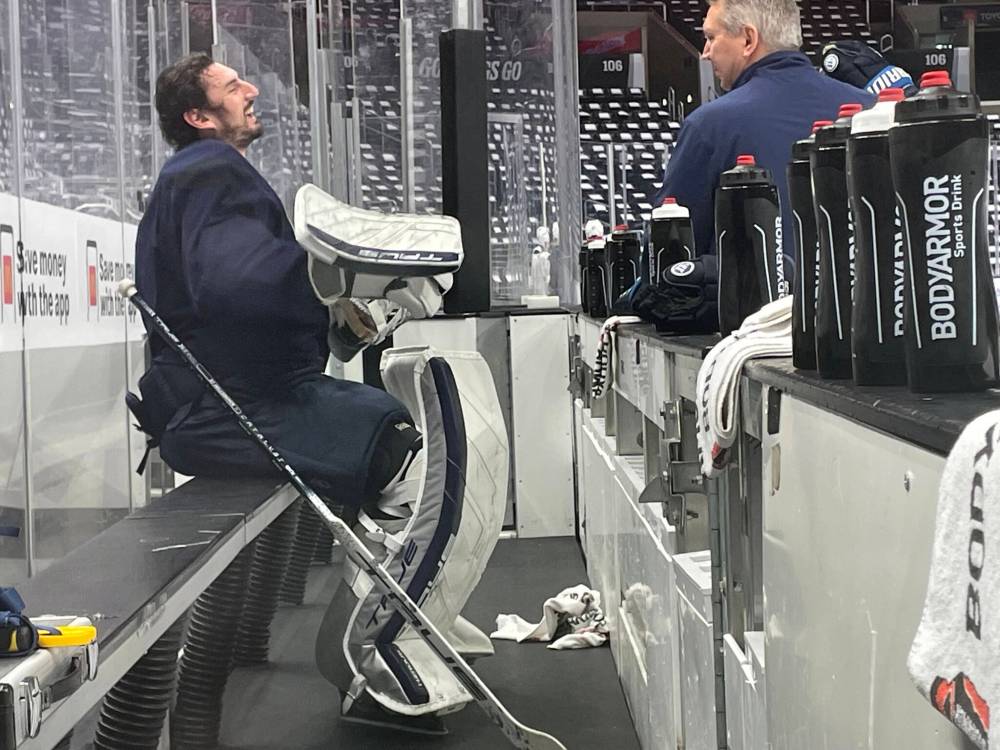 MIKE MCINTYRE / FREE PRESS Connor Hellebuyck and goalie coach Wade Flaherty share a laugh during practice.