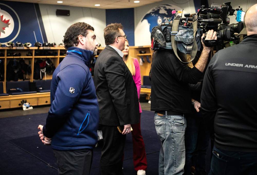 MIKAELA MACKENZIE / FREE PRESS Jets director of communications Scott Brown, left, oversees a player scrum at Canada Life Centre on Tuesday.