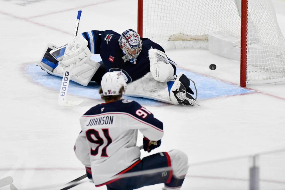 You’d think that might have given the Jets some momentum, with the crowd buzzing about what they’d just seen. But only 23 seconds later, Columbus forward Kent Johnson was left all alone in front of Comrie to backhand a rebound created off another Comrie save off Monahan.