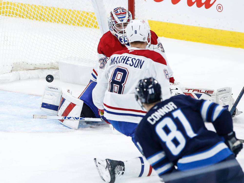 Winnipeg’s Kyle Connor (81) blasts the puck past Montreal goaltender Sam Montembeault (35) as Mike Matheson (8) defends during second-period action Saturday.