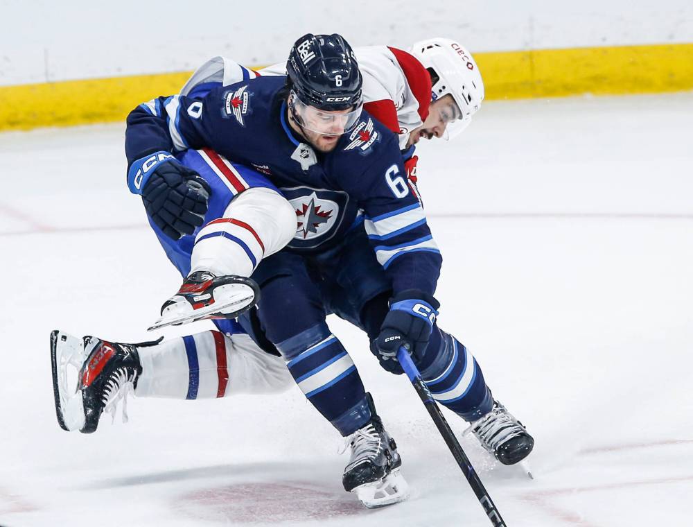 Montreal’s Arber Xhekaj (72) tries to go over Winnipeg blue-liner Colin Miller (6) during third-period NHL action Saturday.