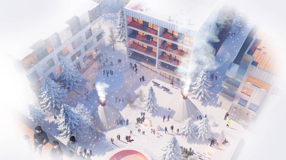 Instead of being set on streets with cars and parking lots, the buildings will be arranged around sunbathed courtyards and narrow, winding alleyways like you might find in a historic European city centre. The choreography of small buildings will break down harsh prairie winds, invite sunlight to the courtyards and preserve views to the sky.