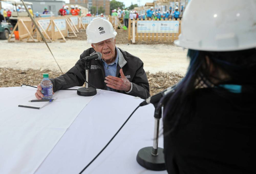 On the first day of the visit, the build site was buzzing. Volunteers leaped to their feet as the Carters arrived; the former president spoke to the crowd for about 13 minutes, offering a long reflection on his Christian faith in a folksy, humorous speech.