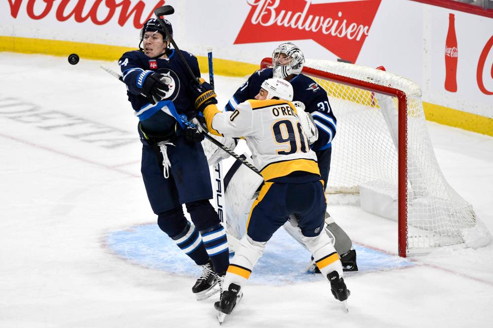 FRED GREENSLADE / THE CANADIAN PRESS Jets defenceman Logan Stanley swats at the puck Monday as Nashville’s Ryan O’Reilly crowds the net in front of Jets goalie Connor Hellebuyck.