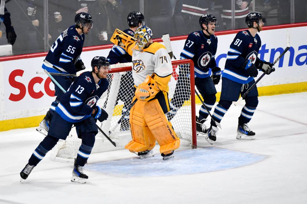 FRED GREENSLADE / THE CANADIAN PRESS Gabriel Vilardi skates and his teammates skate past Nashville goaltender Juuse Saros after scoring a third-period power-play goal Monday.