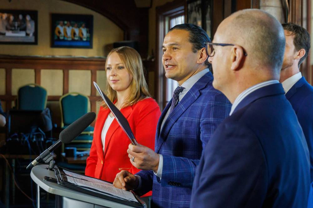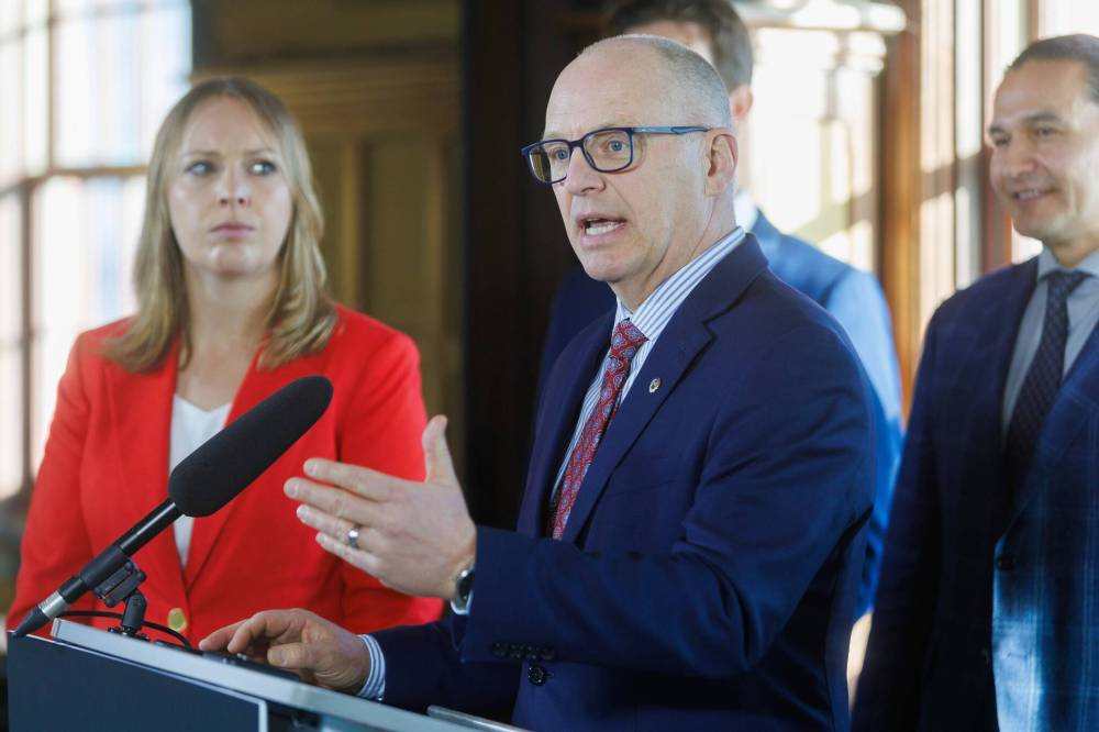 MIKE DEAL / FREE PRESS From left: Tessa Blaikie Whitecloud, MLA David Pankratz (Waverley), Premier Wab Kinew, Housing, Addictions and Homelessness Minister Bernadette Smith and Mayor Scott Gillingham announced a new strategy to tackle chronic homelessness during a news conference Tuesday.