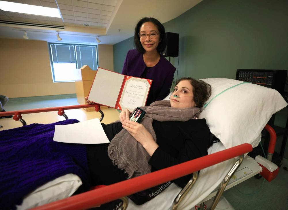 Sen. Flordeliz (Gigi) Osler presents Free Press columnist Shawna Forester Smith with the King Charles Coronation Medal from the Gov.-Gen. of Canada at Deer Lodge Centre Thursday. Shawna was chosen for her 15 years of advocacy work in health care, including her most recent efforts of documenting the state of health care from her bed at Deer Lodge where she’s a resident on a chronic-care unit.