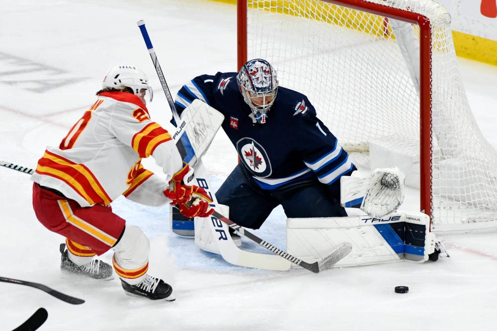 Winnipeg Jets’ goaltender Eric Comrie makes one of his 20 saves against Calgary Flames’ Blake Coleman during NHL action in Winnipeg on Sunday.